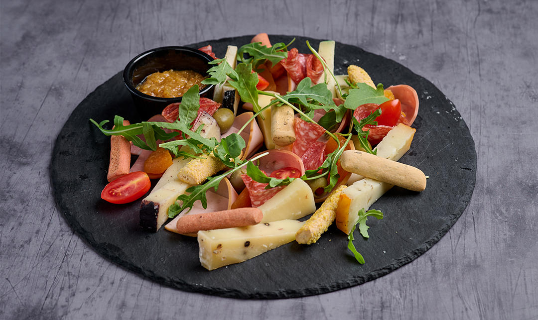 Mix αλλαντικών, τυριών, συνοδεύεται με μαρμελάδα και κριτσίνια.