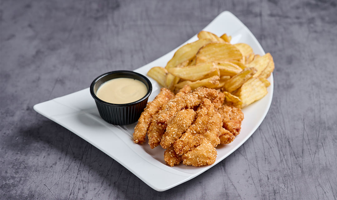 Κοτόπουλο πανέ με σουσάμι, συνοδεύεται με πατάτες και sauce μουστάρδας.