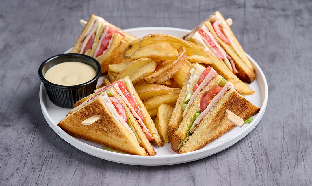 Φρυγανισμενο ψωμί sando με Iceberg, ντομάτα, gouda, γαλοπούλα, ψητό κοτόπουλο, μαγιονέζα, συνοδεύεται με πατάτες και sauce μουστάρδας.