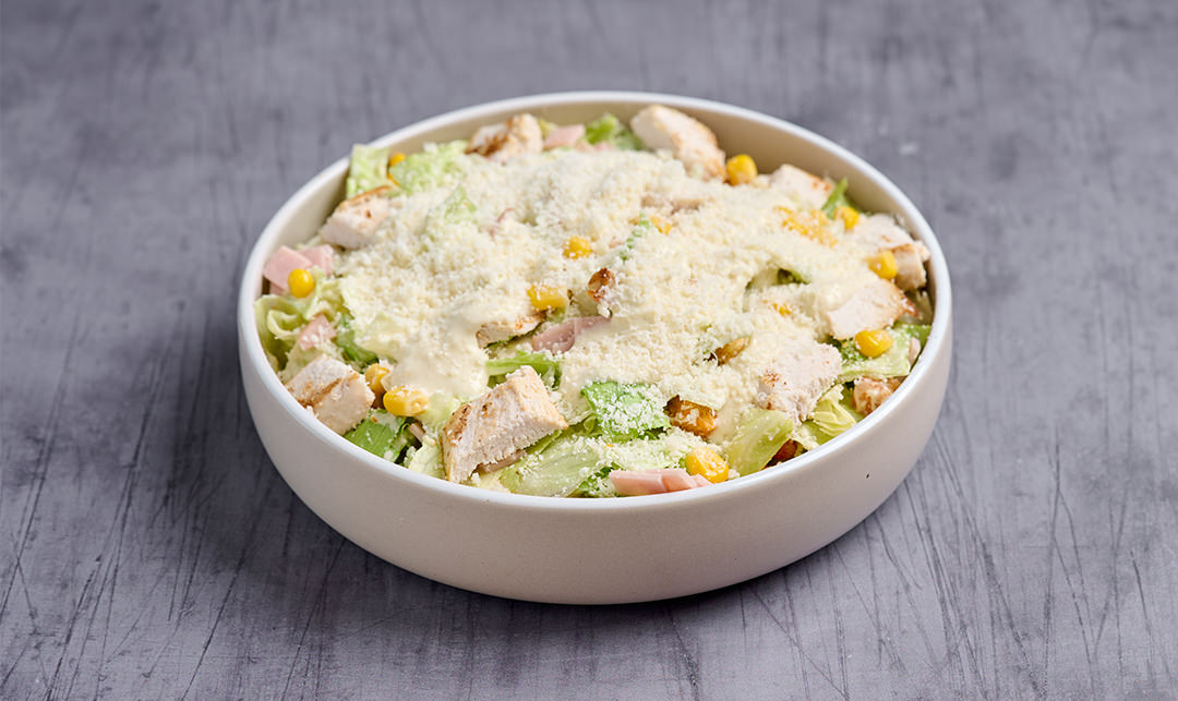 Iceberg, καλαμπόκι, γαλοπούλα, παρμεζάνα, τραγανά κρουτόνς, ψητό κοτόπουλο, και caezar’s sauce.