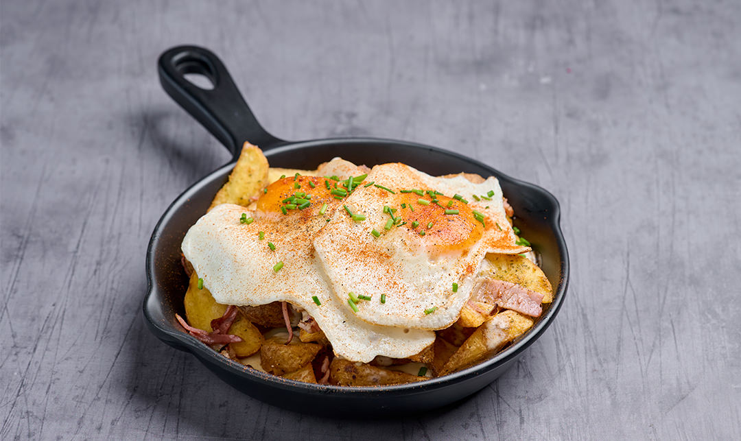 Πατάτες country με κρέμα παρμεζάνας, μπέικον, αυγά ματιά, σχοινόπρασο και πάπρικα καπνιστή.
