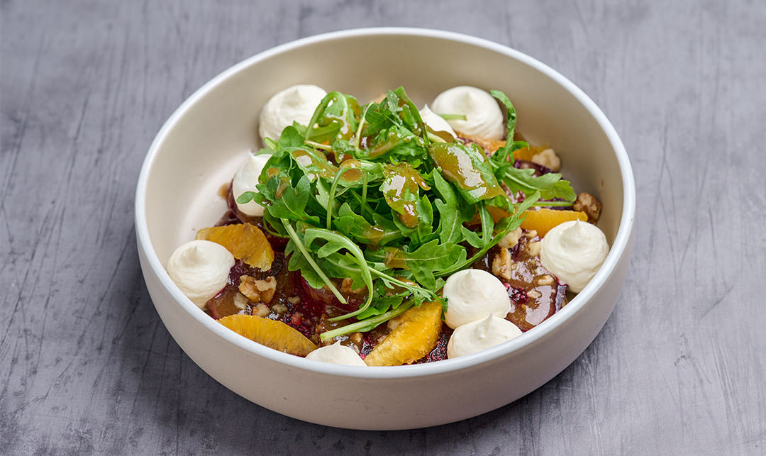 Παντζάρια,baby ρόκα, φιλέτο πορτοκαλί, τριμμένο καρύδι, vinaigrede βαλσάμικου και κρέμα κατσικίσιου τυριού.