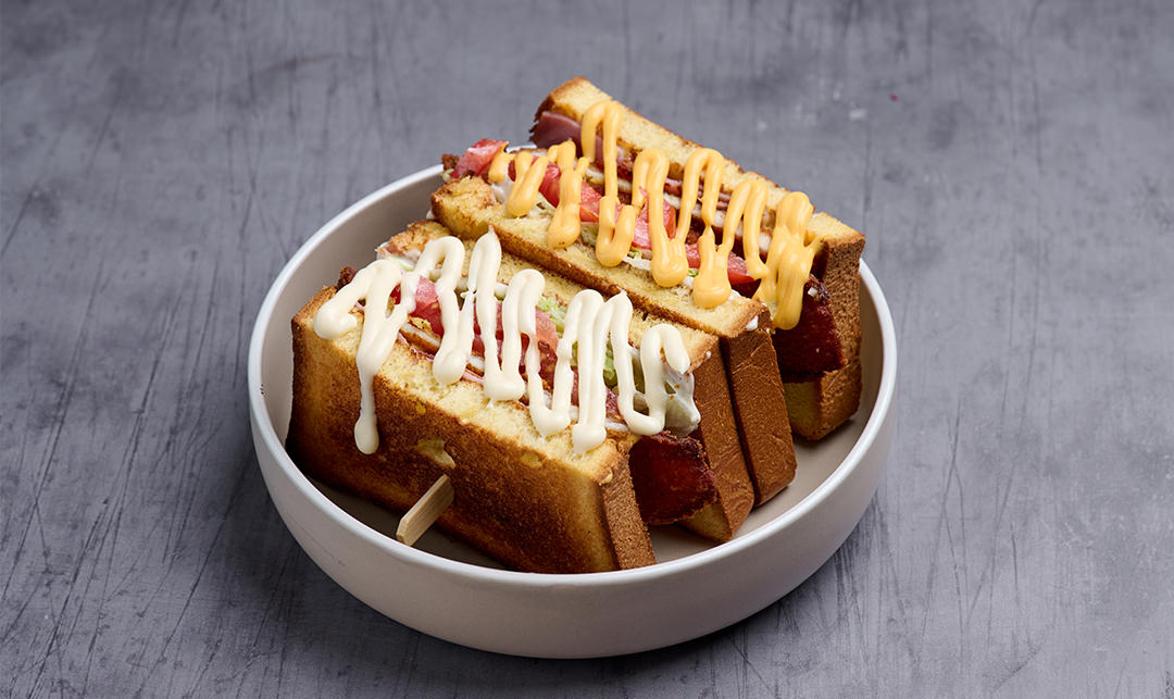 Φρυγανισμενο ψωμί sando με Iceberg, ντομάτα, gouda, γαλοπούλα, μπέικον, μαγιονέζα, συνοδεύεται με πατάτες και sauce μουστάρδας.