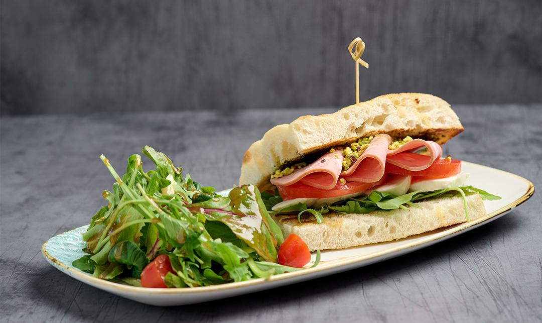 Φρυγανισμένη focaccia με πέστo βασιλικού, baby ρόκα, ντομάτα, mozzarella di buffalo,μορταδέλα ελαιόλαδο και τριμμένο φιστικί αιγίνης.
