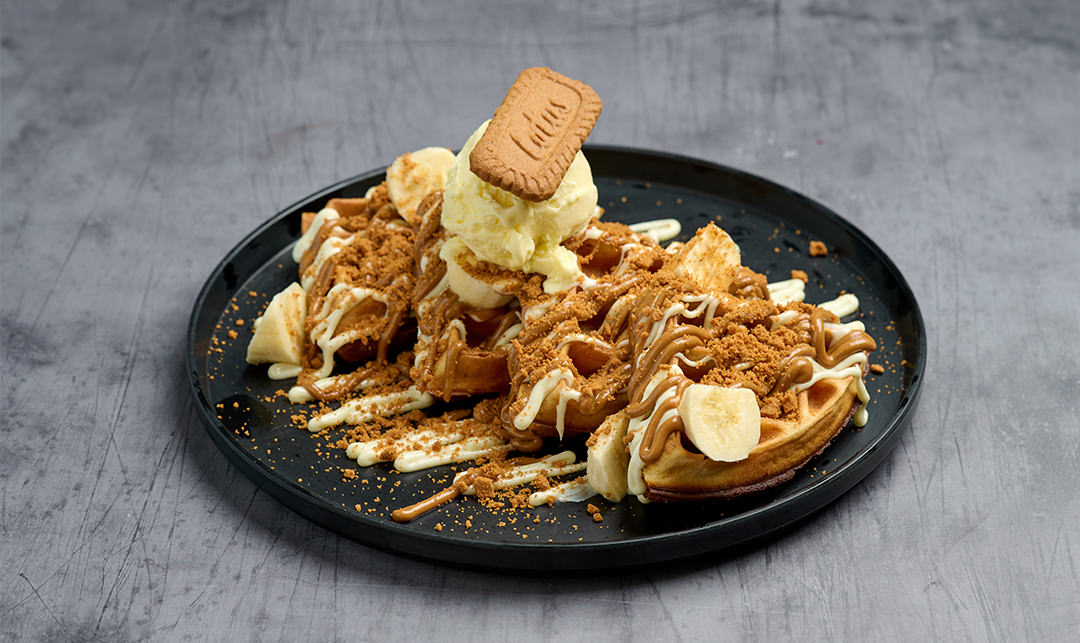 Πραλίνα λευκής σοκολάτας, πραλίνα Biscoff, crumble lotus, μπανάνα και παγωτό βανίλια.