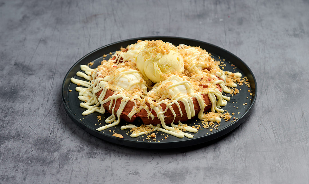 Cream cheese fros\ng, πραλίνα λευκής σοκολάτας, crumble βουτύρου, φράουλες και παγωτό βανίλια.